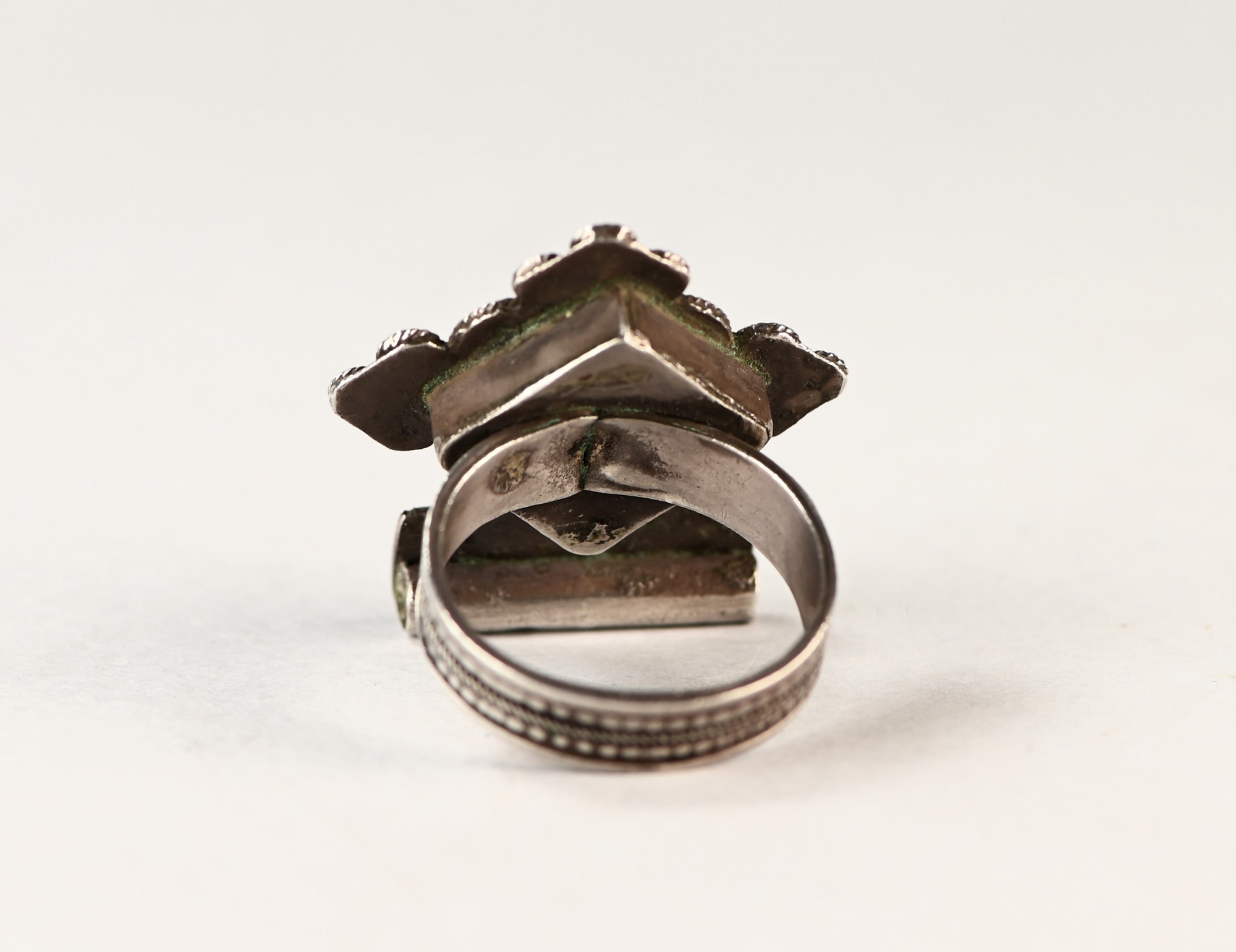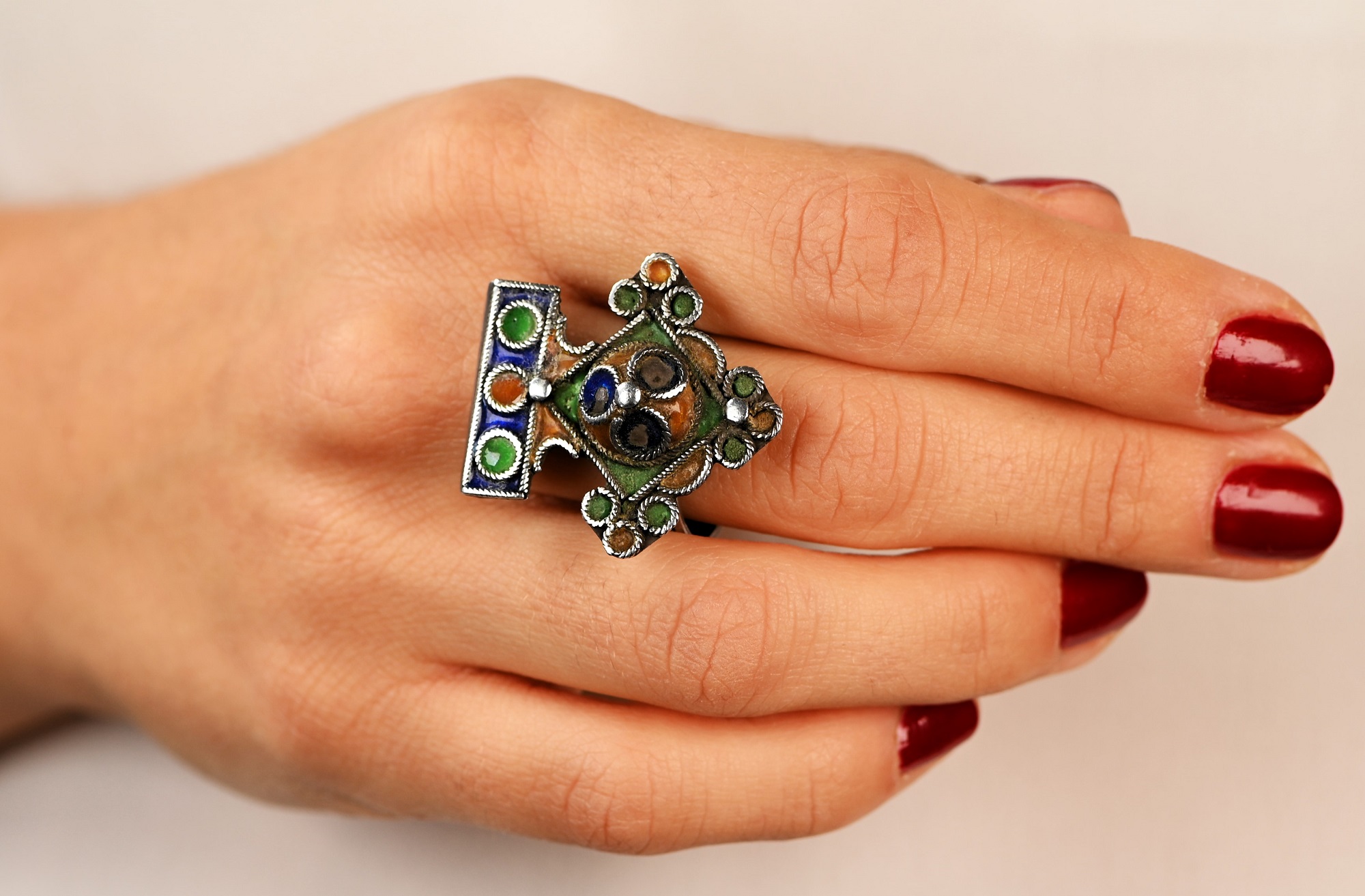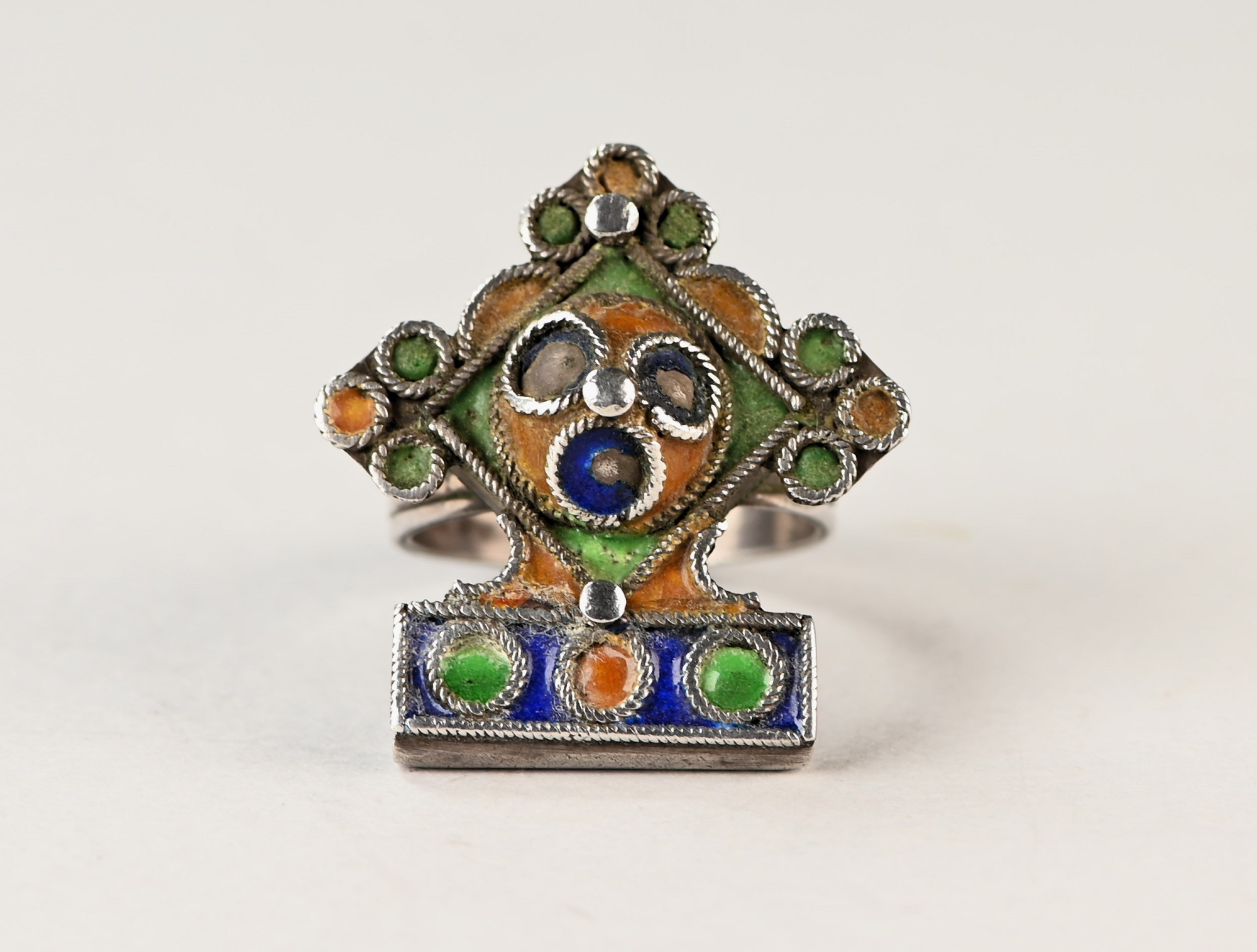 Anello in argento smaltato con antica croce “Boghdad” sul fronte, ornata da smalti nei toni del blu, arancione e verde, che misura 3 × 2,7 cm.