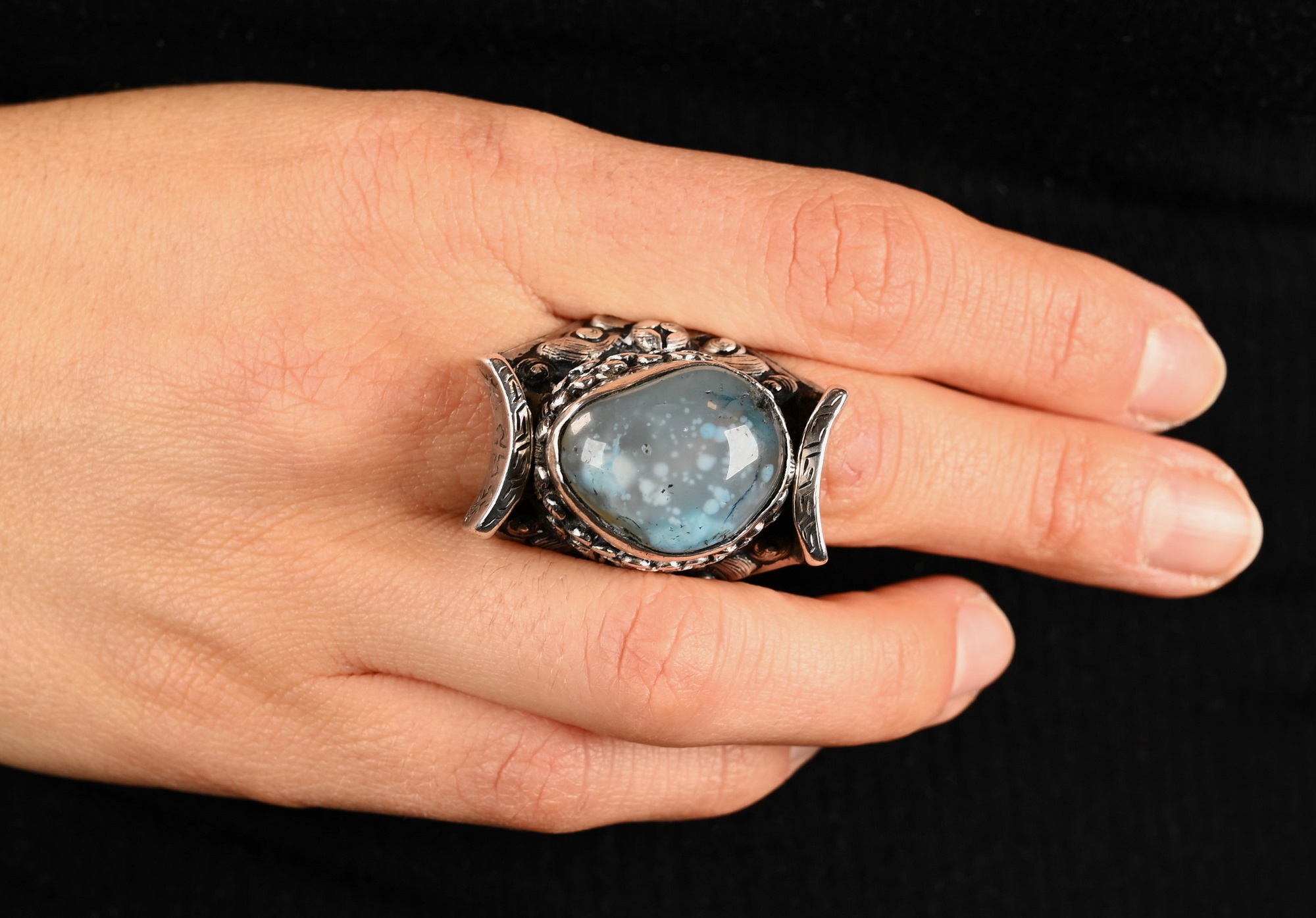 Anello tradizionale himalayano a sella in argento decorato con un elemento in calcedonio incastonato al centro.