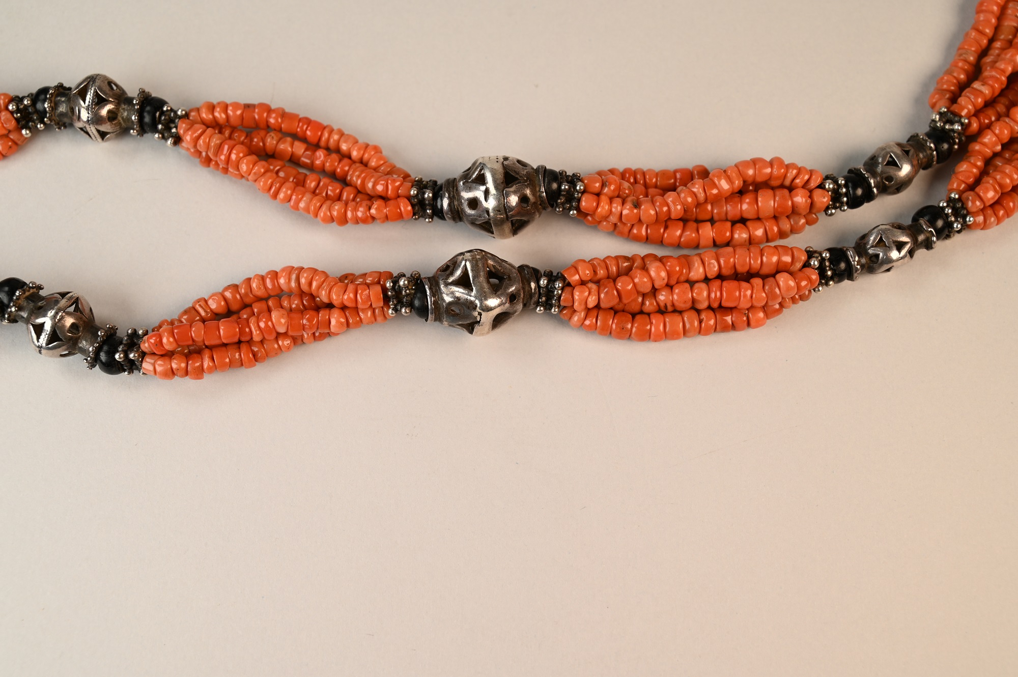Collana matrimoniale tagica a più fili con perle di corallo naturale e antichi e elementi in argento.