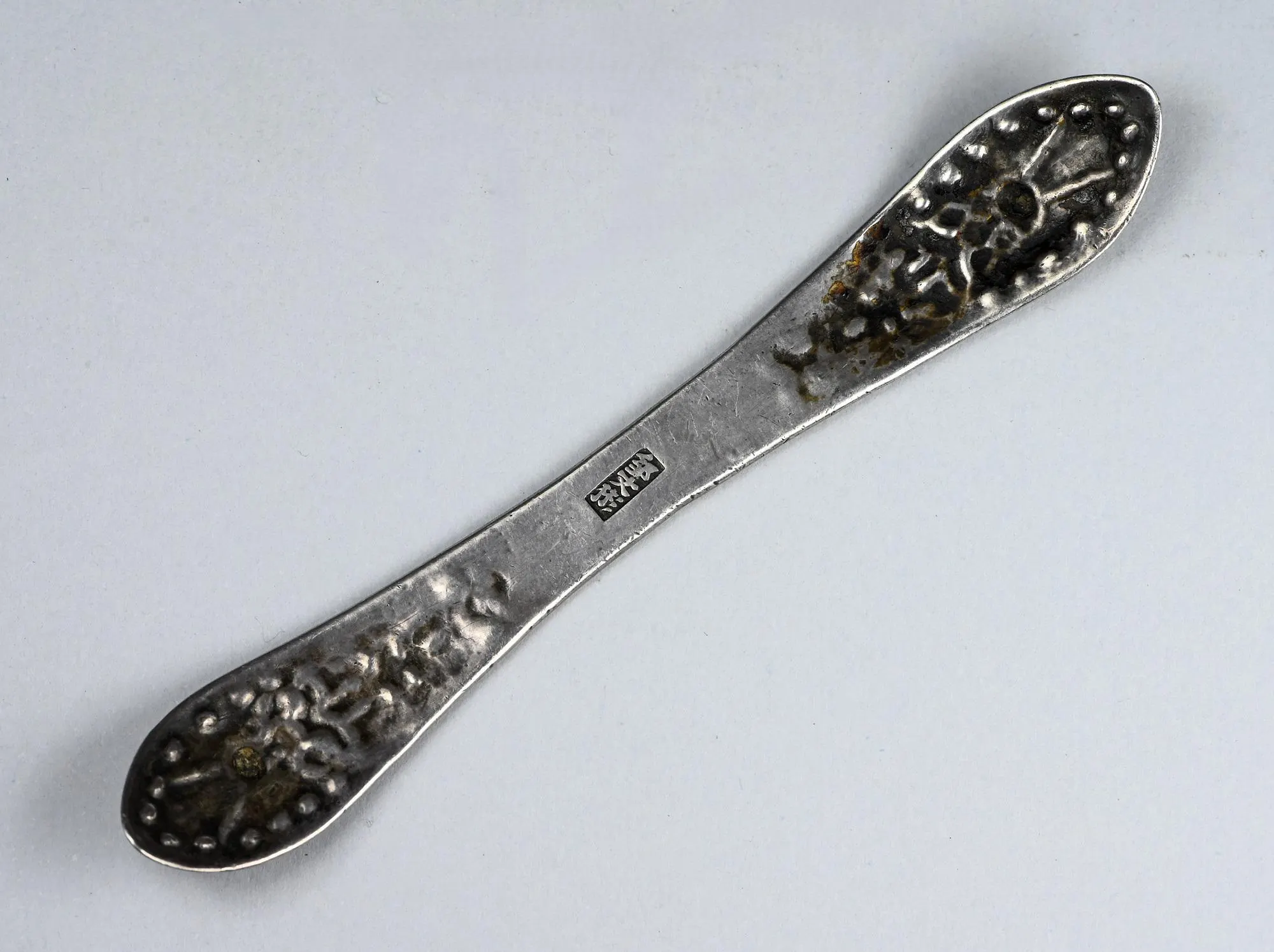Questa forcina è realizzata in argento di alta qualità e presenta una bella patina invecchiata.