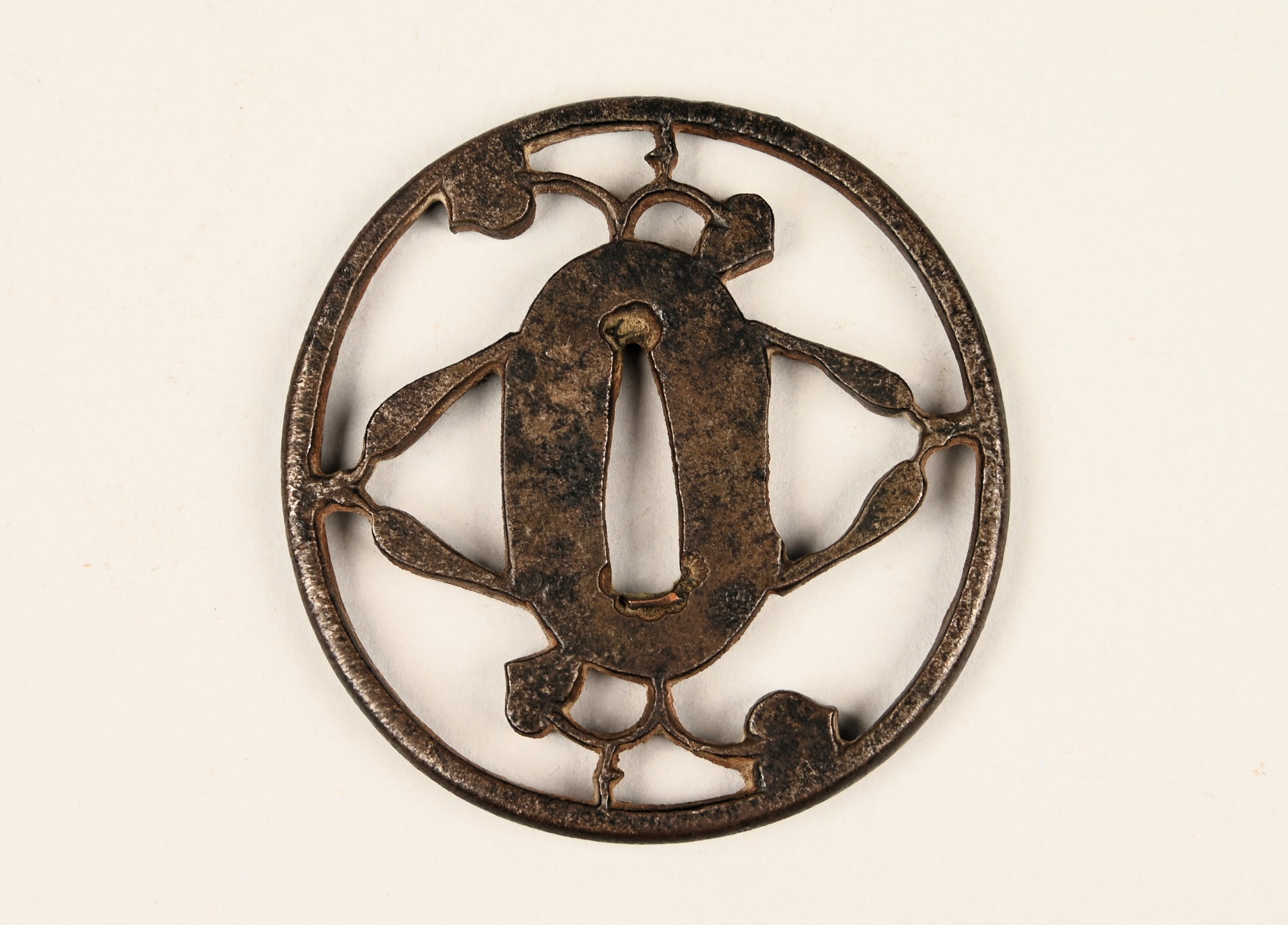 Elegante tsuba in ferro forgiato, realizzata nello stile essenziale tipico della scuola Kanayama. Di forma ovale (maru-gata), presenta una raffinata lavorazione sukashi (a traforo) con motivi astratti simmetrici, probabilmente di ispirazione vegetale stilizzata. L’intera superficie è caratterizzata da una patina brunita antica, con tracce di ossidazione coerenti con l’età. Il bordo mostra leggere irregolarità compatibili con la forgiatura a mano.
