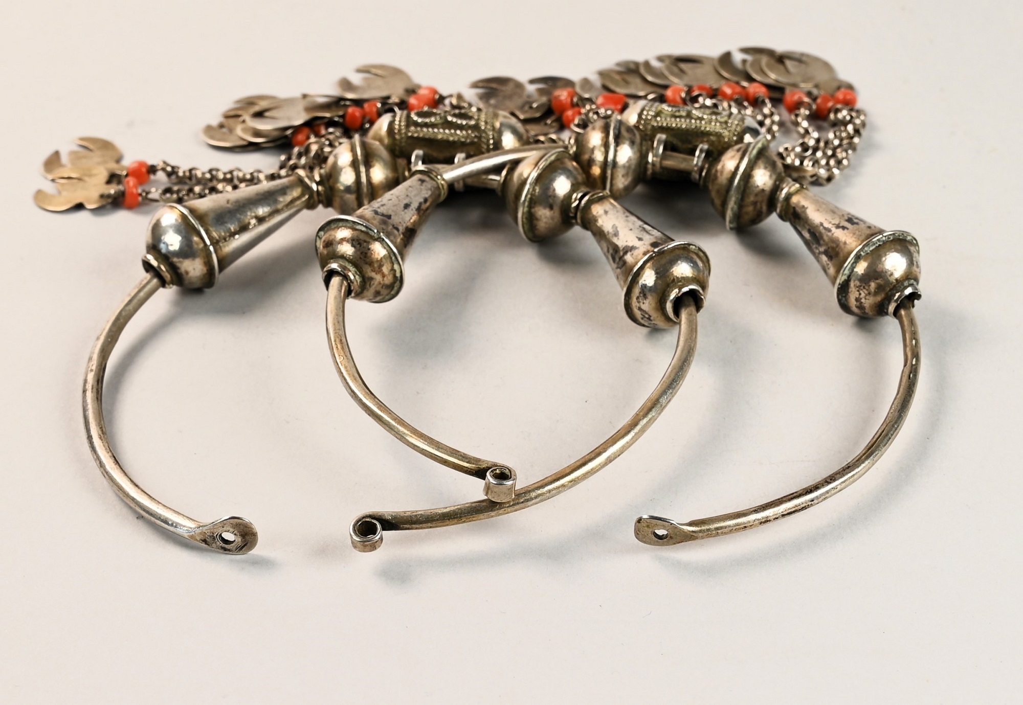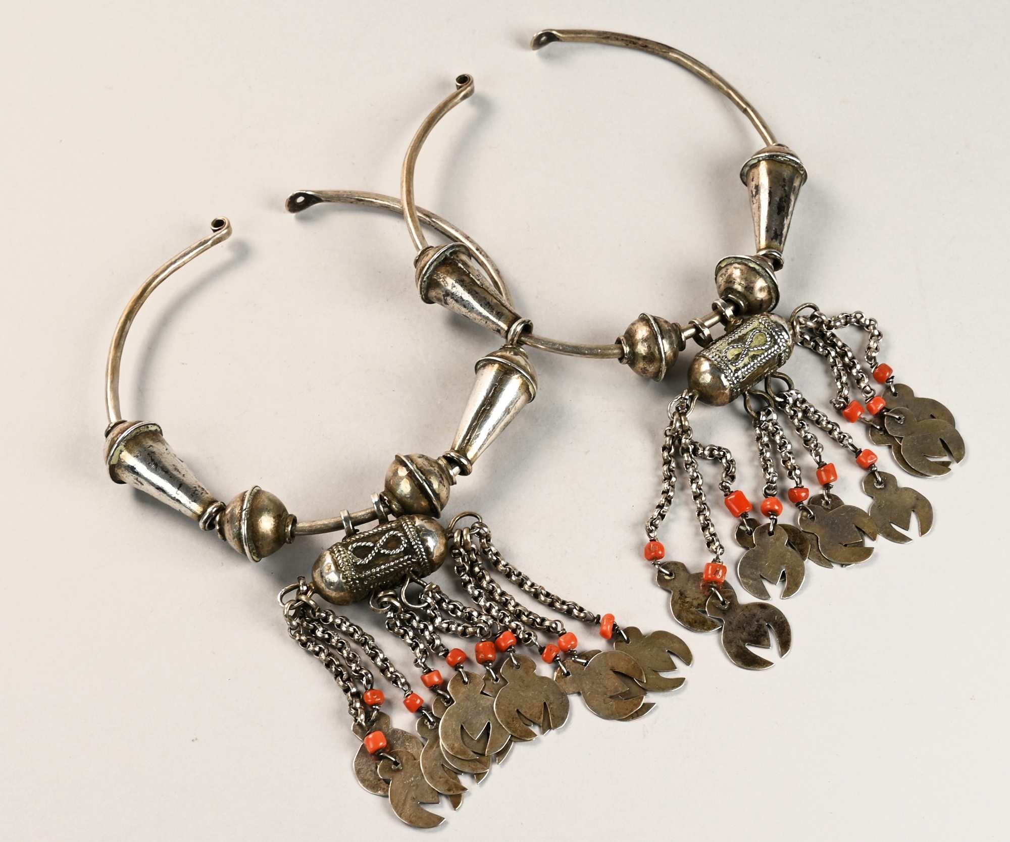 Antichi e grandi orecchini berberi a cerchio in argento, decorati con coralli e piccoli pendenti appesi a sottili catene lungo il bordo inferiore.
