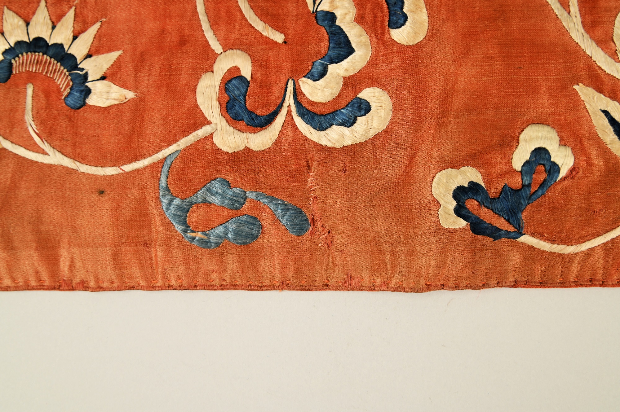 Antico frammento in seta cinese con splendidi ricami raffiguranti piante, fiori e una farfalla stilizzata in alto a sinistra.