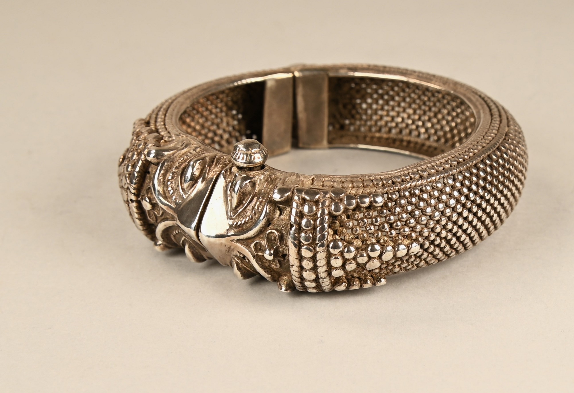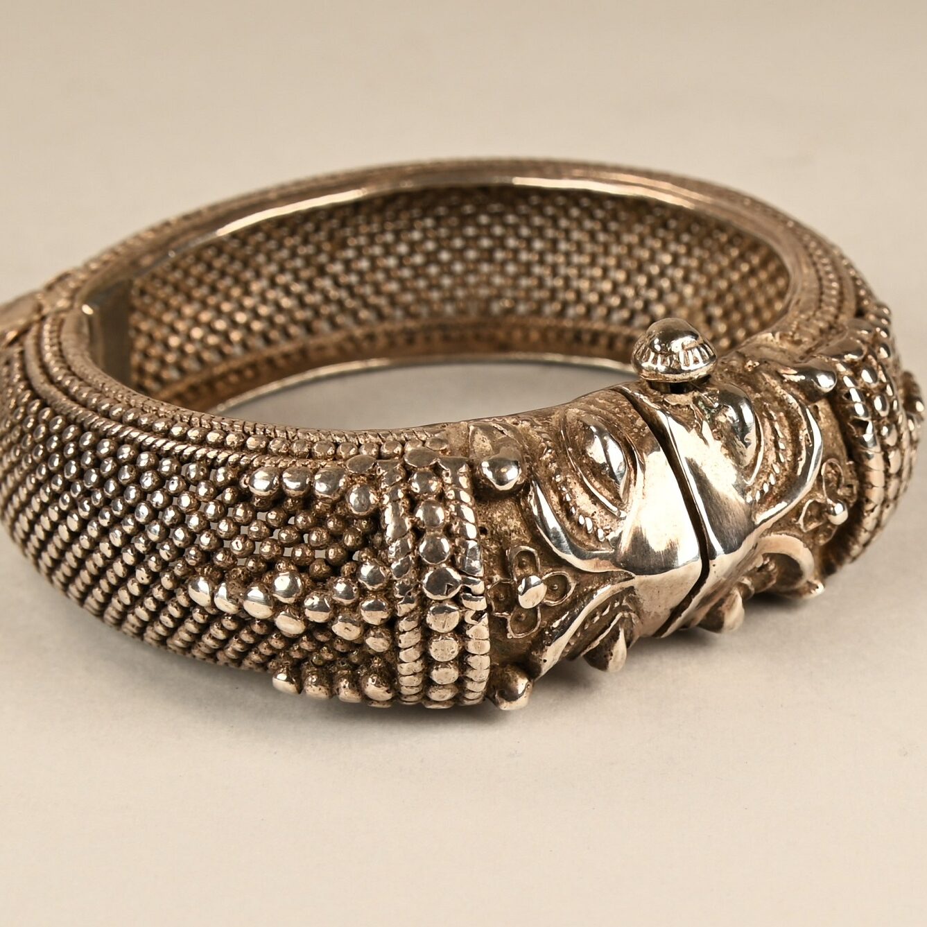 Bracciale in argento di alta qualità proveniente dal Madhya Pradesh o dal Rajasthan. Sulla parte frontale raffigura due Makara affrontati, mitici mostri marini che fungono da veicoli della dea Ganga — personificazione del fiume Gange — e del dio delle acque terrestri, Varuna. Nella tradizione indiana, i poteri magici del Makara sono associati alla fertilità dei fiumi e delle acque.