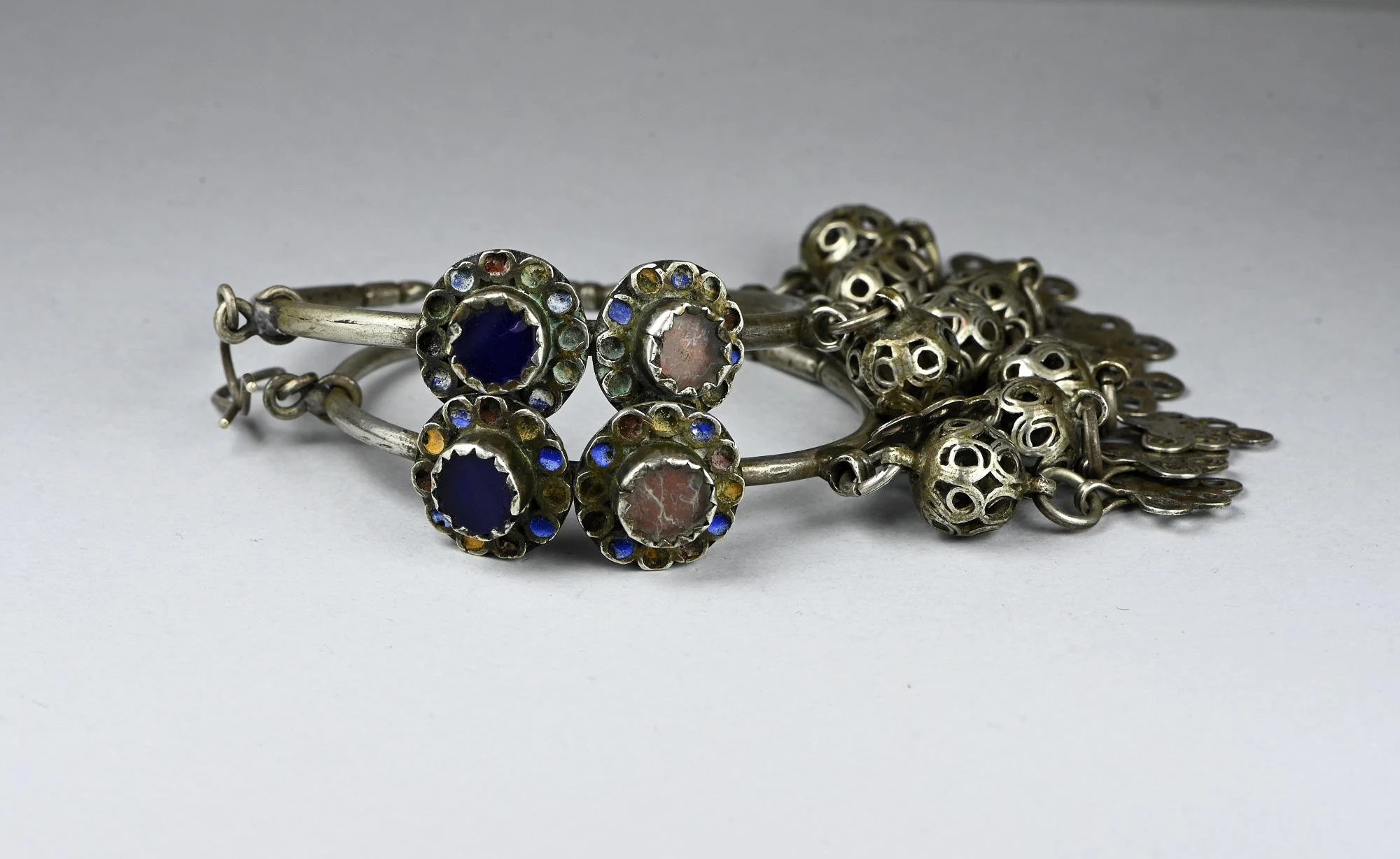 Questi orecchini sono costituiti da cerchi decorati sul davanti da due elementi in vetro incastonati e circondati da splendidi smalti nei toni del blu, azzurro e giallo. Dalla parte inferiore dei cerchi pendono perline in argento lavorato e pendenti in argento antico.