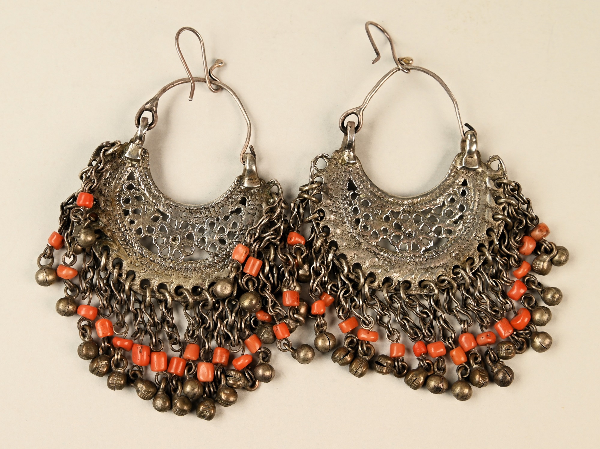 Antichi orecchini nuziali in argento a forma di mezzaluna, finemente decorati con motivi floreali incisi sul fronte. Dal bordo inferiore pendono fini catene ornate da perline di corallo antico e piccoli pendenti.