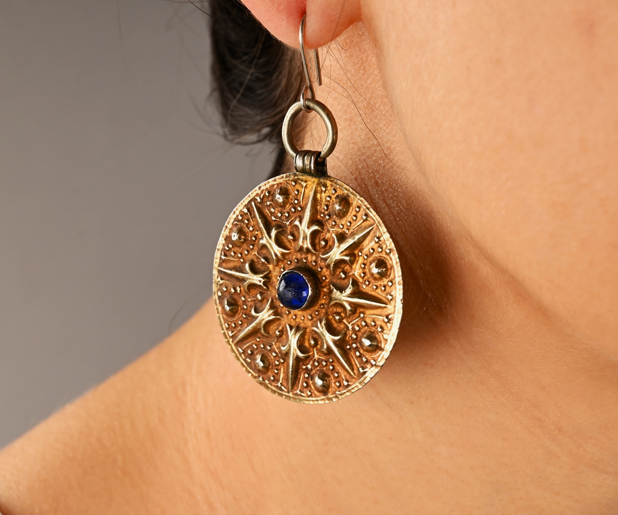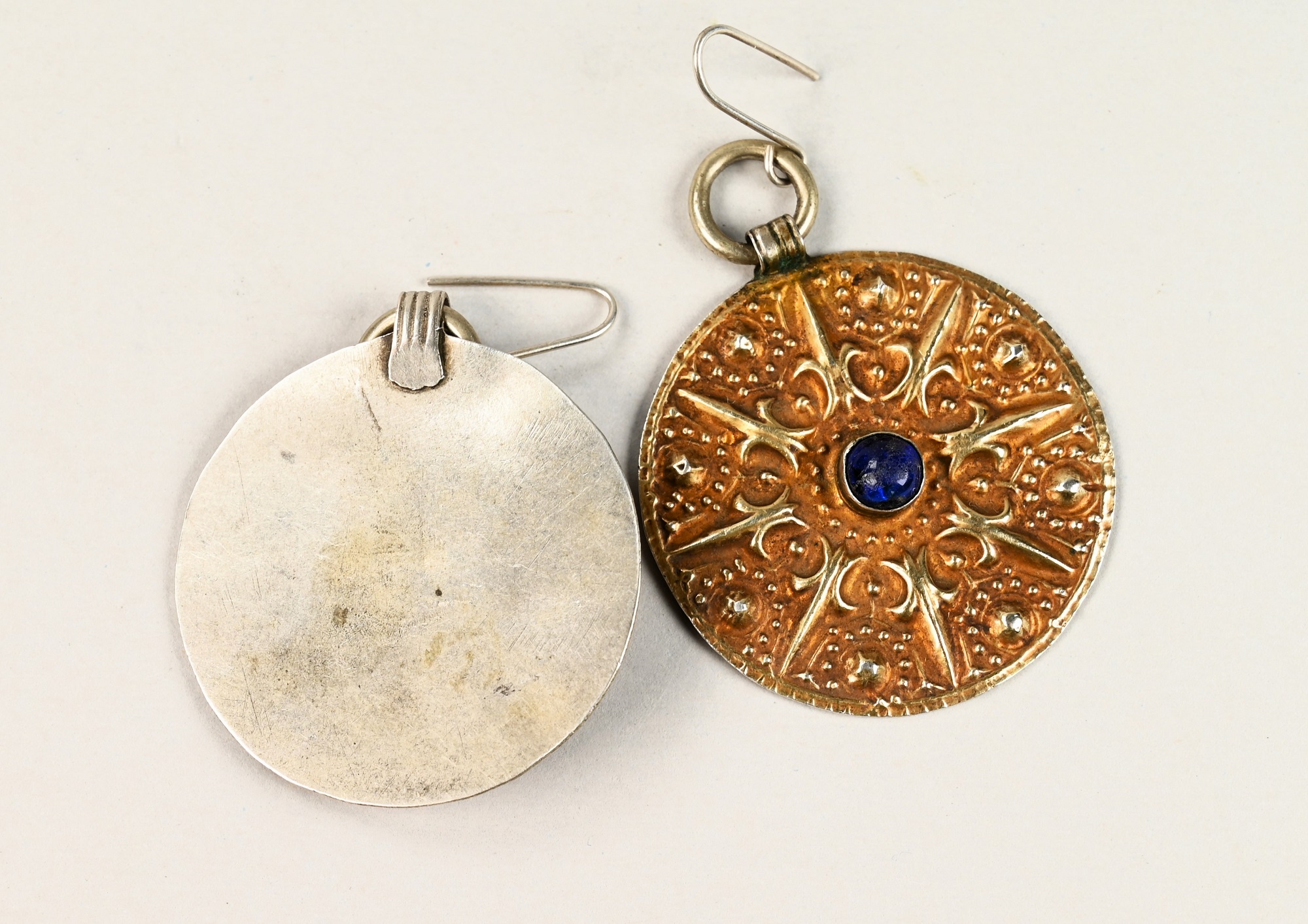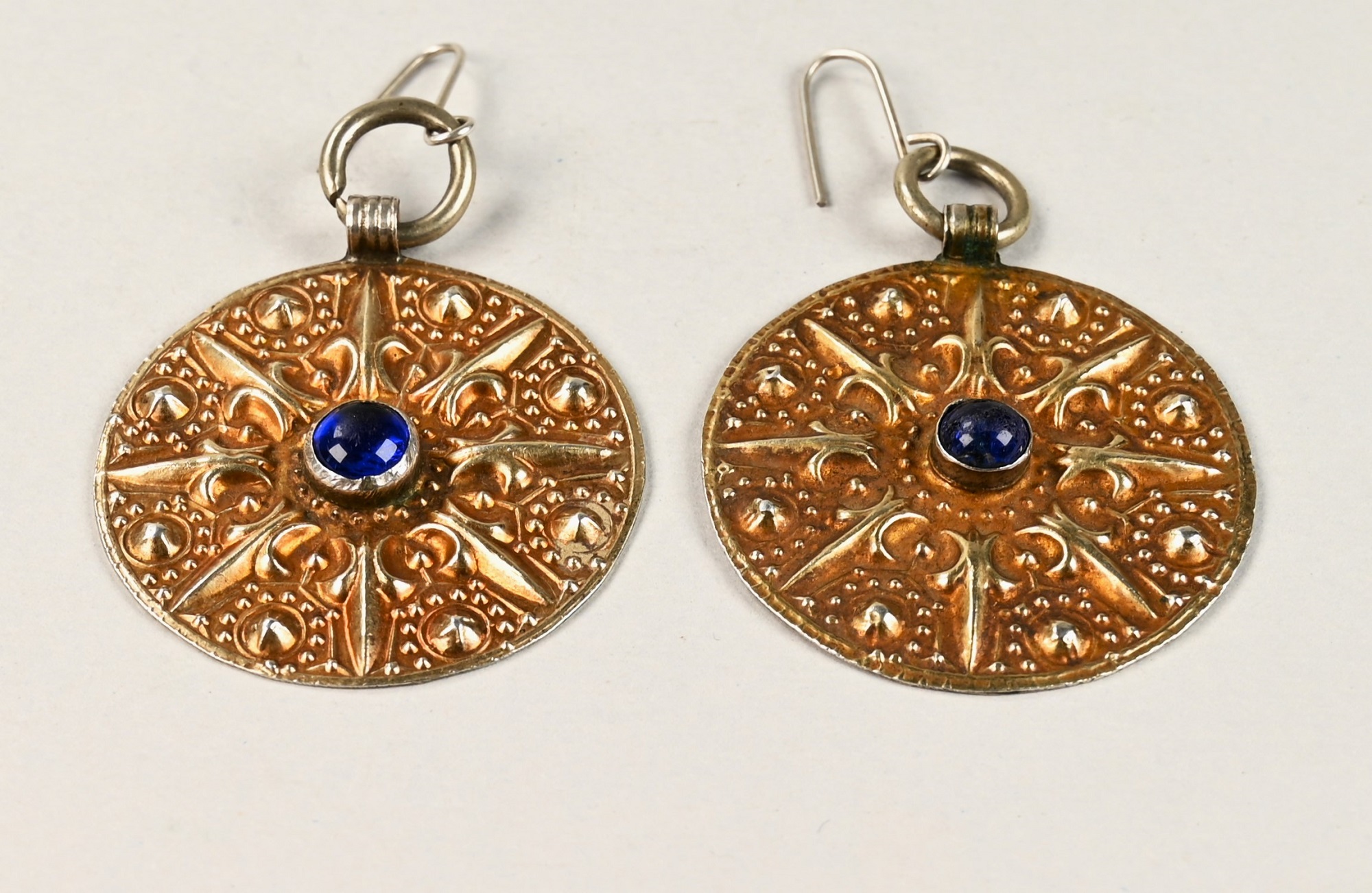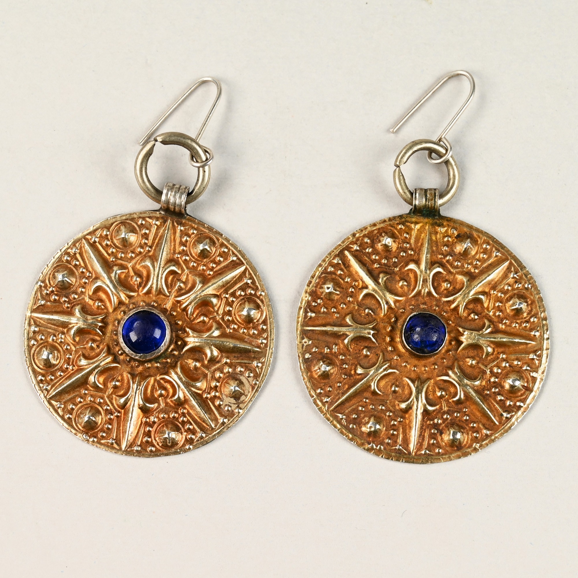 Orecchini di provenienza turcomanna, composti da dischi in argento dorato, finemente decorati con motivi in rilievo e impreziositi da un’antica doratura. Al centro di ciascun disco è incastonata una perla in vetro di colore blu scuro, che dona un elegante contrasto cromatico.