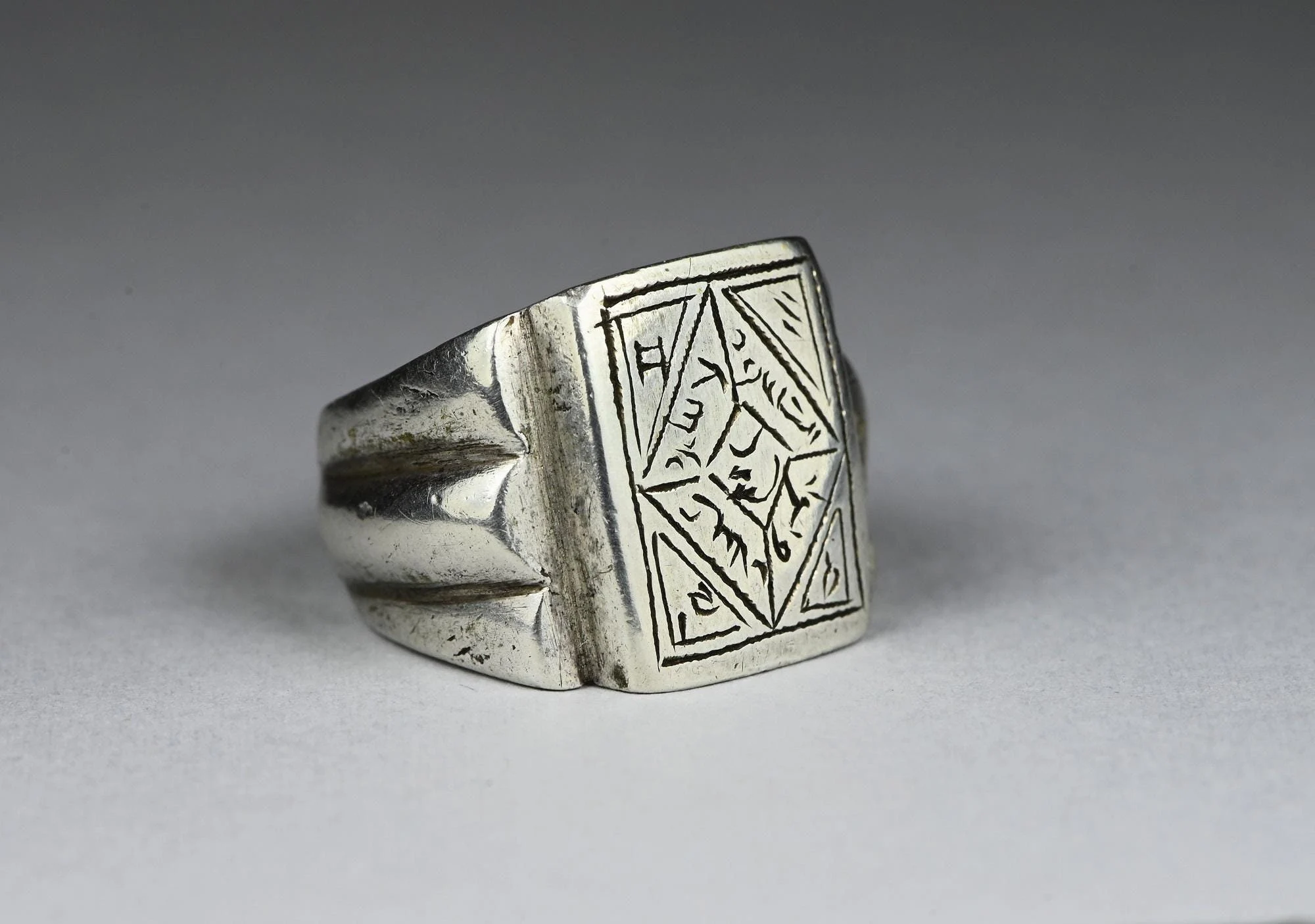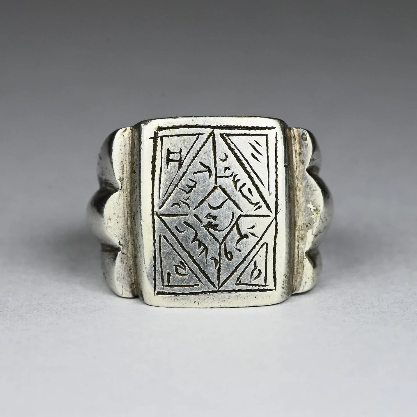 Anello talismano in argento finemente decorato con incisioni raffiguranti simboli e lettere arabe.
